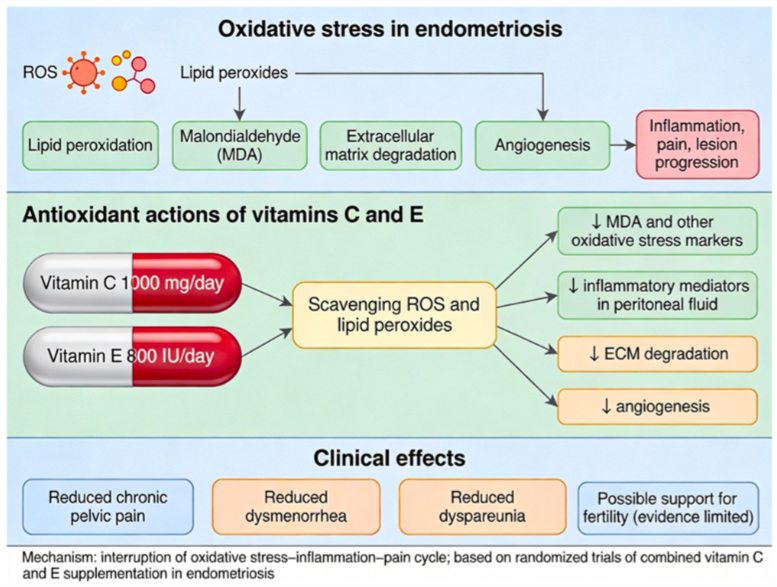 Ensaios clínicos randomizados sugerem que as vitaminas D, C e E podem reduzir a dor relacionada à endometriose e marcadores de estresse oxidativo. Já as evidências quanto aos desfechos de fertilidade ainda são limitadas e inconclusivas.