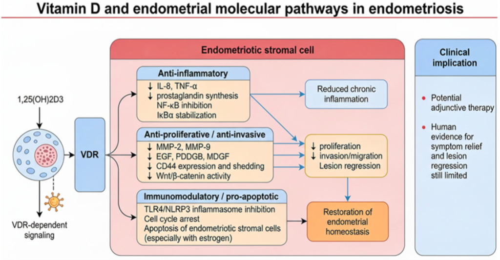 A vitamina D pode exercer efeitos moduladores devido os receptores presentes em células endometriais e do sistema imunológico. Há redução na produção de citocinas pró-inflamatórias, como IL-6 e TNF-α, e modulação das vias de sinalização associadas à proliferação e invasão celular.